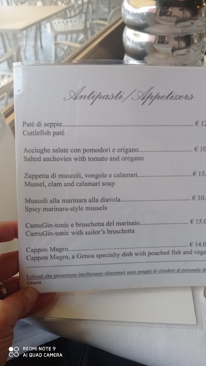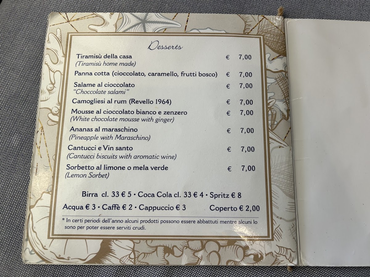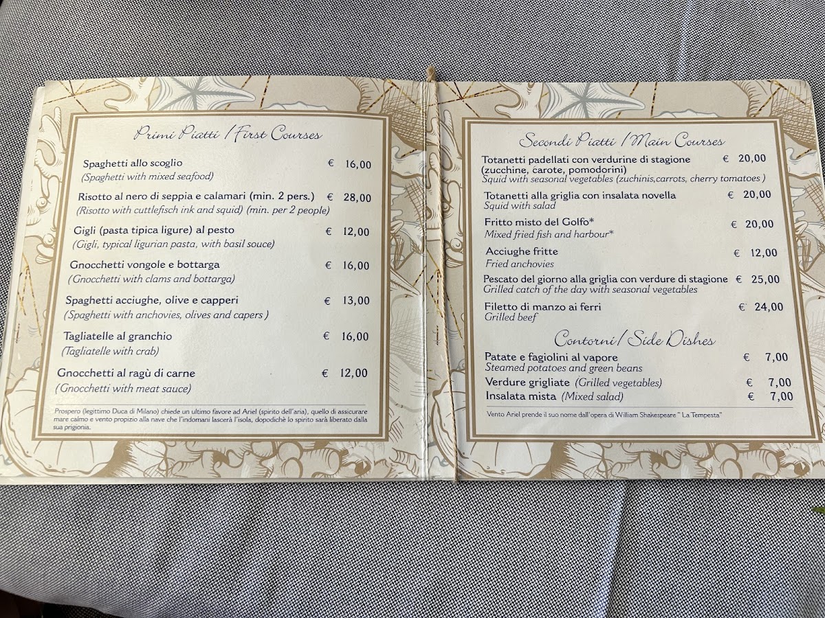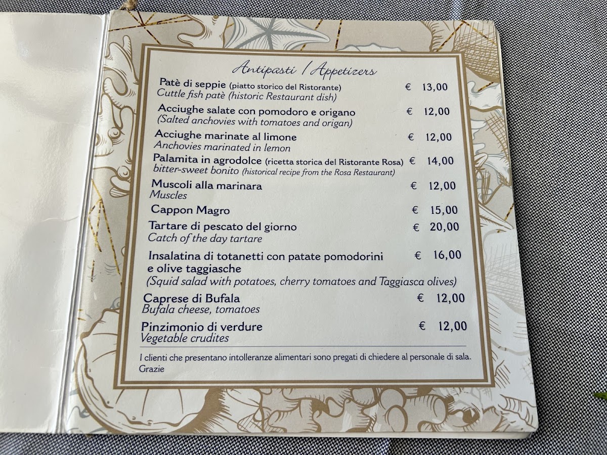 The menu here reads like a confident celebration of Ligurian coastal cuisine, with seafood clearly at its heart and executed across a wide range of styles. Pasta dishes such as Spaghetti Allo Scoglio, Spaghetti Mare, Spaghetti Con Acciughe, Risotto Alla Pescatora, Riso Nero Di Seppia Con Totani, and Trofie Al Pesto showcase a strong respect for local ingredients, from mixed shellfish and anchovies to cuttlefish ink and classic basil pesto. Starters and lighter plates reinforce this maritime identity, with Acciughe Impanate, Salted Anchovies with Tomato and Oregano, Paté Di Seppie, Bianchetti Al Vapore, Tartare Di Tonno, and Tartare Di Ricciola offering contrasts between raw, steamed, and crisp textures while keeping flavors clean and focused. Traditional recipes such as Cappon Magro and Muscoli Alla Marinara Alla Diavola add depth and regional character, balancing heritage with bold seasoning. For mains, dishes like Triglie In Guazzetto and Totanetti E Verdurine Alla Piastra continue the seafood narrative with comforting sauces and grilled simplicity. Desserts provide a familiar but satisfying close, with Tiramisu & Espresso, Creme Brulee, and the house specialty Camogliesi Al Rum delivering sweetness without excess. Even the cocktail selection, highlighted by a refreshing Mojito, complements the menu’s relaxed, seaside rhythm. Overall, the menu feels cohesive and well-curated, emphasizing freshness, tradition, and variety while staying true to its coastal roots.